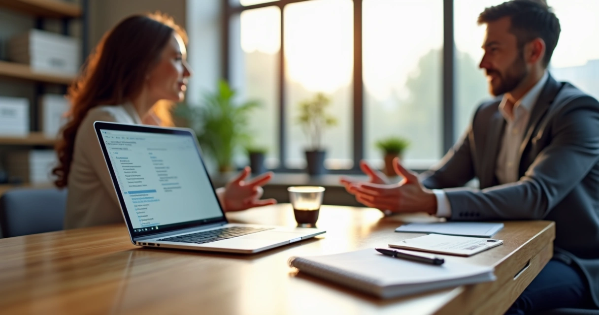 Mesa de reunião organizada com laptop, caderno, caneta e copo de café ao lado de duas pessoas conversando