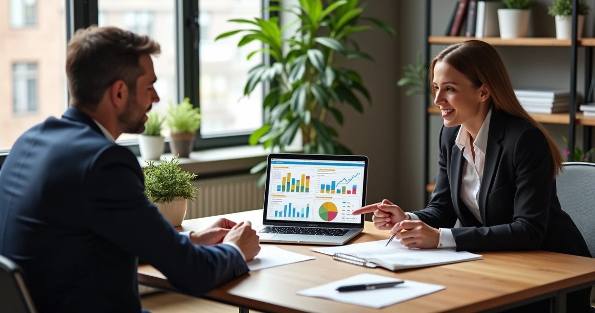 Pessoa negociando valor em reunião de vendas consultivas com gráficos e anotações em laptop