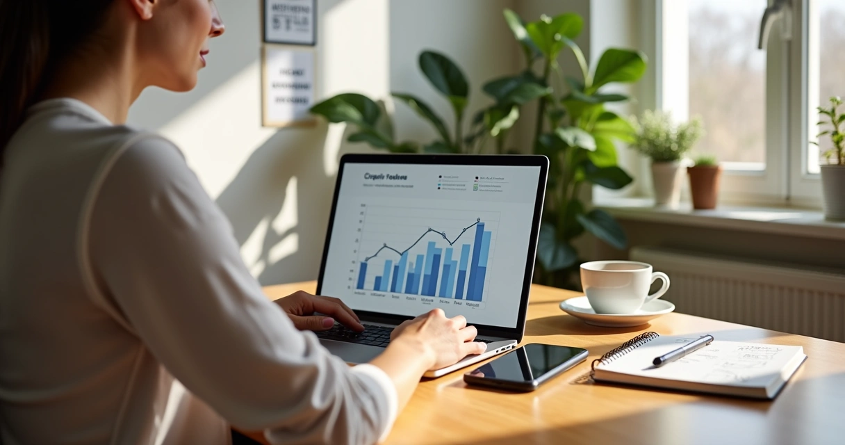 Mulher organizando rotina de trabalho remoto com laptop, caderno e smartphone em mesa iluminada